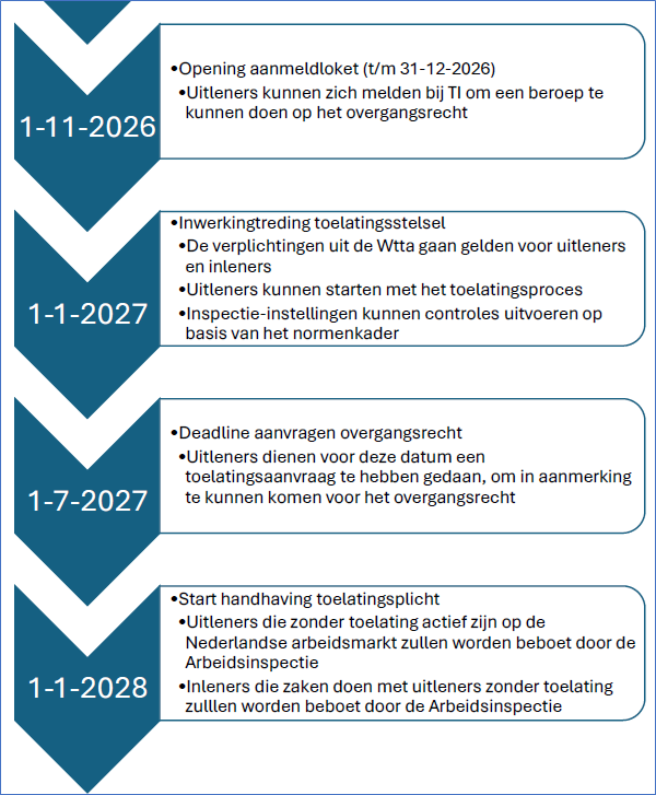 De minister heeft de beoogde inwerkingtredingsdatum voor het toelatingsstelsel vastgesteld op 1 januari 2027. Dit betekent dat op 1 januari 2028 de toelatingsplicht zal ingaan. Vanaf dit moment zal de Nederlandse Arbeidsinspectie gaan handhaven op de toelatingsplicht en zullen in- en uitleners die zich niet aan de wet houden worden beboet.