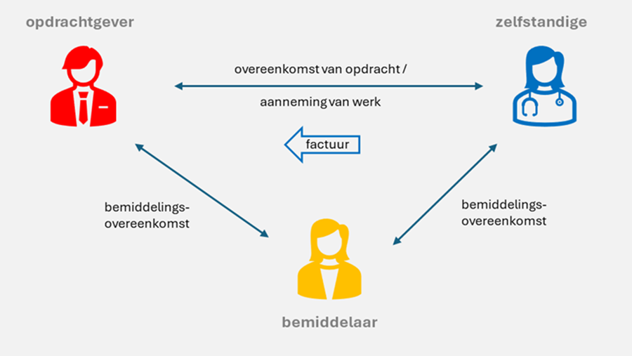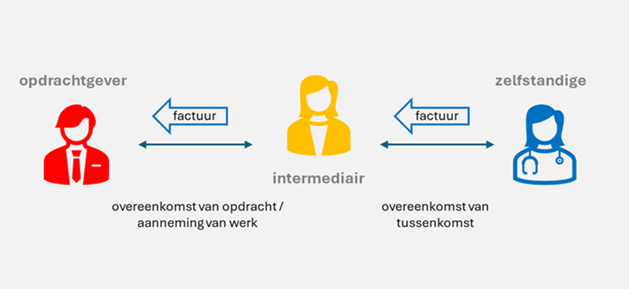 Van tussenkomst is sprake als de intermediair (tussenpersoon) zelf optreedt in de overeenkomst met de opdrachtgever en vervolgens een aparte overeenkomst aangaat met de opdrachtnemer (de zzp’er). De intermediair is daarmee juridisch verantwoordelijk voor de uitvoering van de opdracht en fungeert als contractspartij aan beide zijden.
